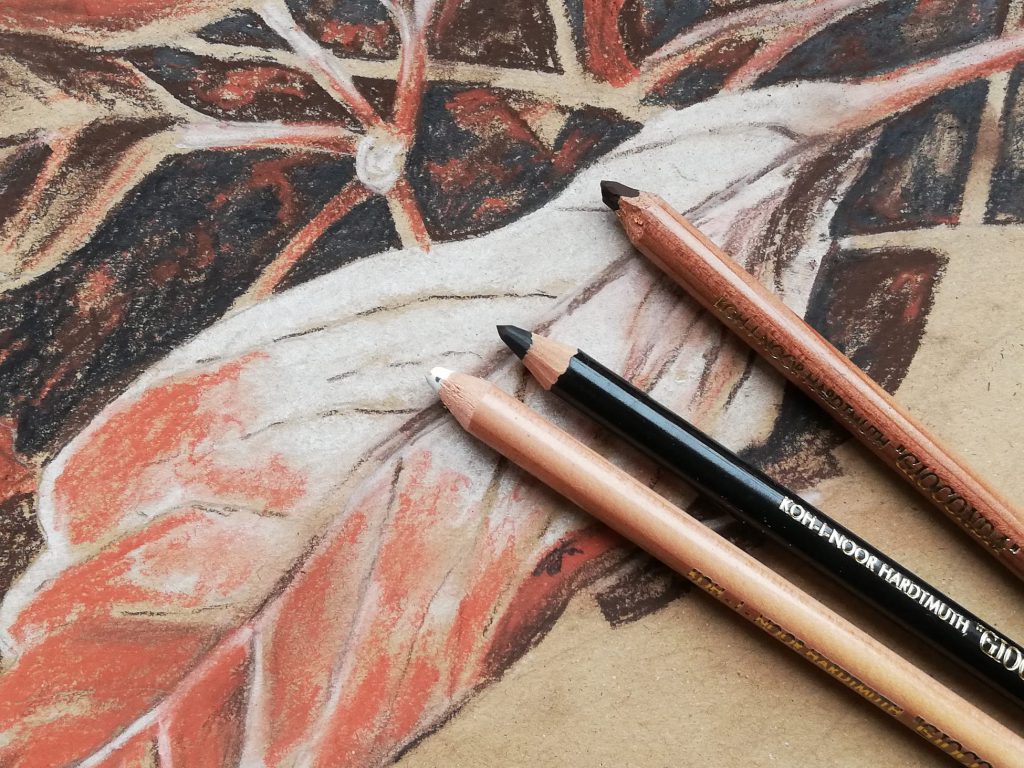 Inspired by russet autumn colors, I’ve tried my hand at drawing with Koh-I-Noor sepia and sanguine. Since my paper was toned, I also bought charcoal and white chalk.