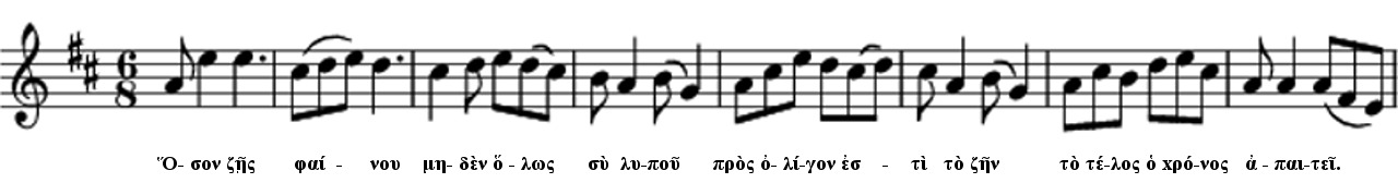 The song itself follows. What I admire most is that Seikilos isn’t wailing. The deceased is still alive for him; he wants Euterpe to be happy: