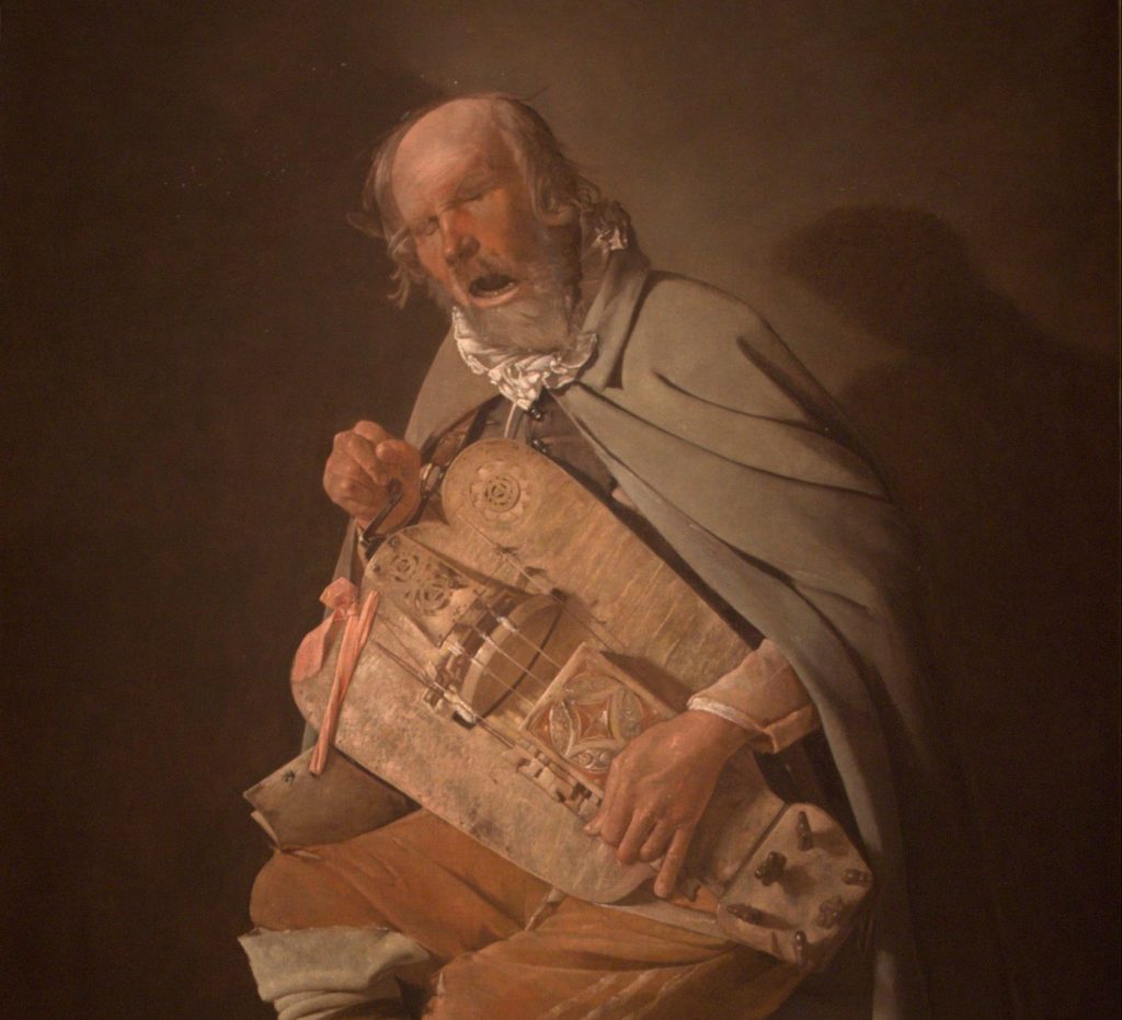 The hurdy-gurdy, a primitive music instrument that does not require any special skills from the performer, was traditionally associated with the disabled. Müller and Schubert’s character may be similar to the blind beggar depicted in the famous painting The Hurdy-Gurdy Player, by Georges de La Tour:
