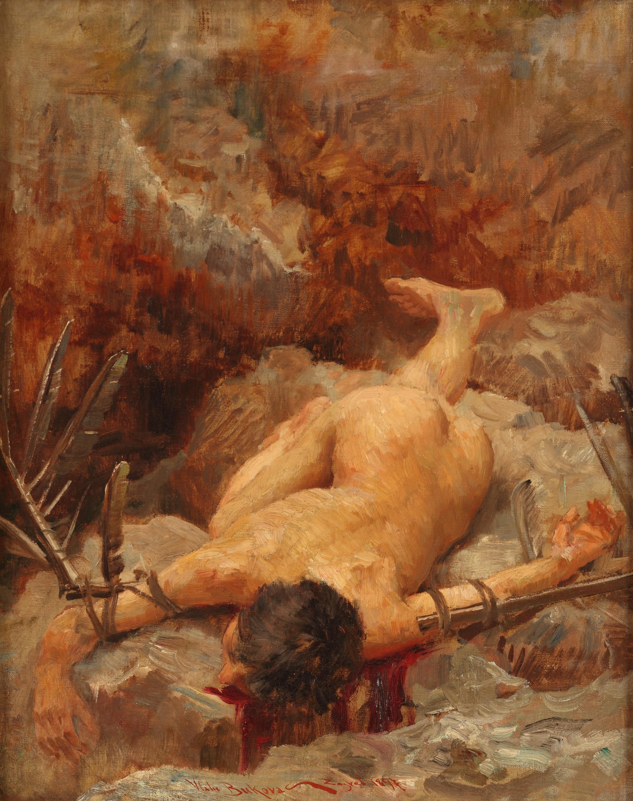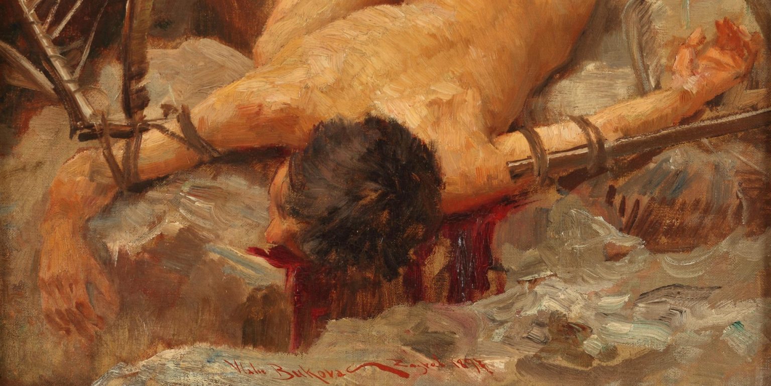 If you look closely at the lower part of the work, you’ll see Bukovac’s signature. The painter applied deep red paint as if he signed the canvass with blood.