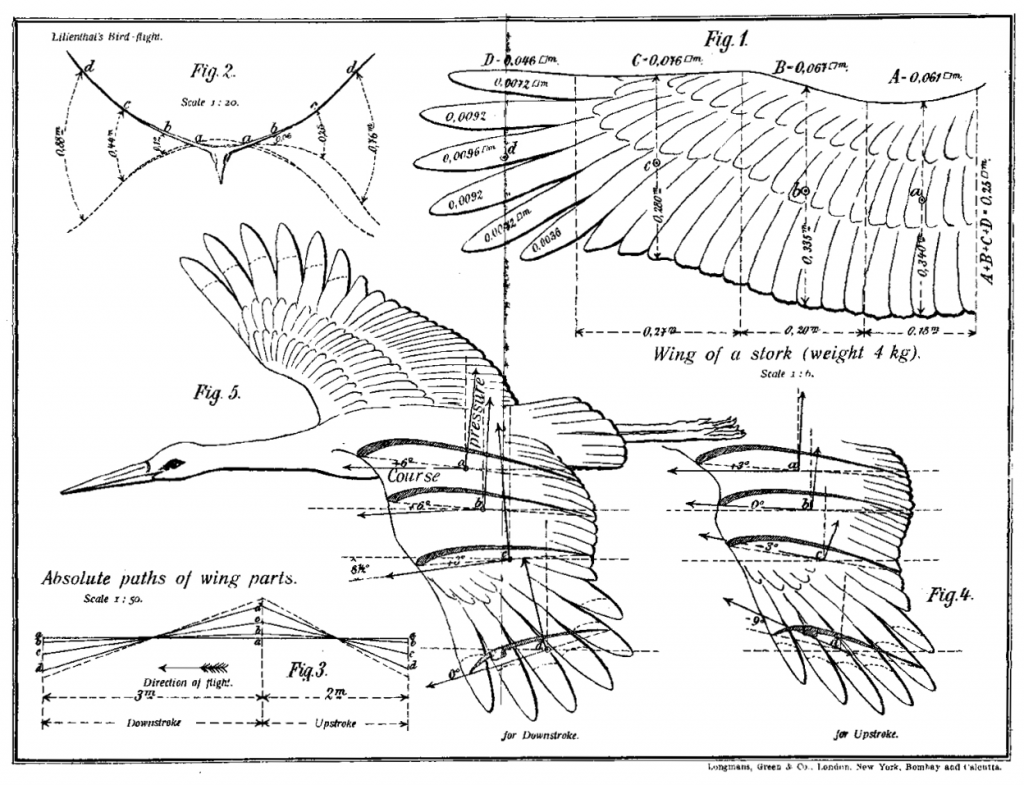 The picture above is a fragment of the book Birdflight as the Basis of Aviation written by Otto Lilienthal. This inventor developed a dozen models of monoplanes, two biplanes, and wing-flapping aircraft. While creating and testing his gliders, he thoroughly documented each promising observation. “With his fundamental research on birds and airfoils, he founded the science of wing aerodynamics,” it reads on the website of Otto Lilienthal museum.