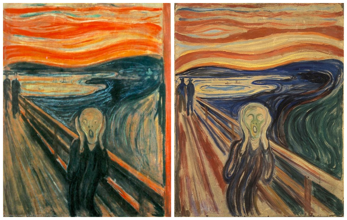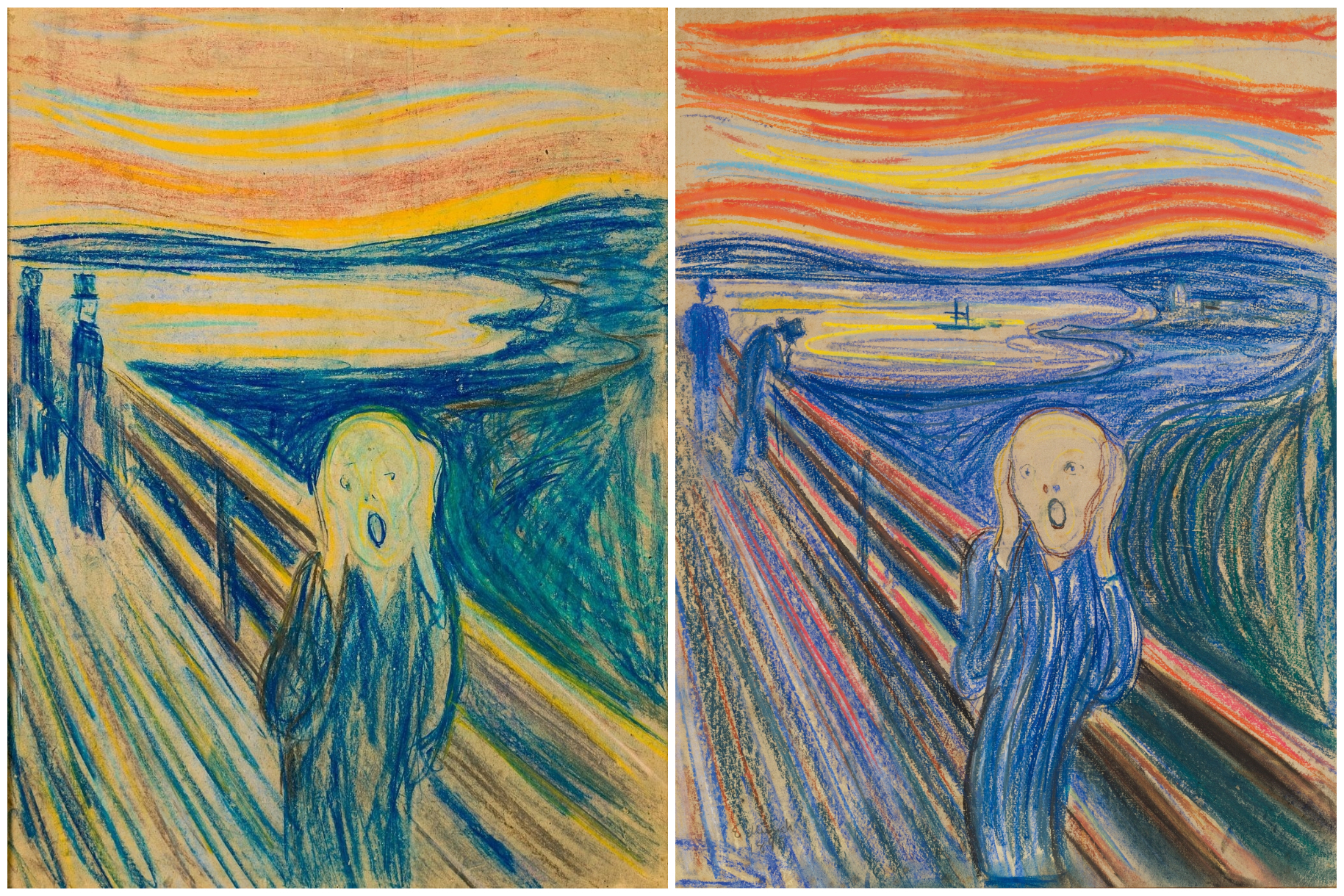 On the left, you see the famous The Scream that inspires social media users to continually make new memes. It’s often considered to be an oil painting, yet in fact, it was created with tempera, oils, and pastel.
