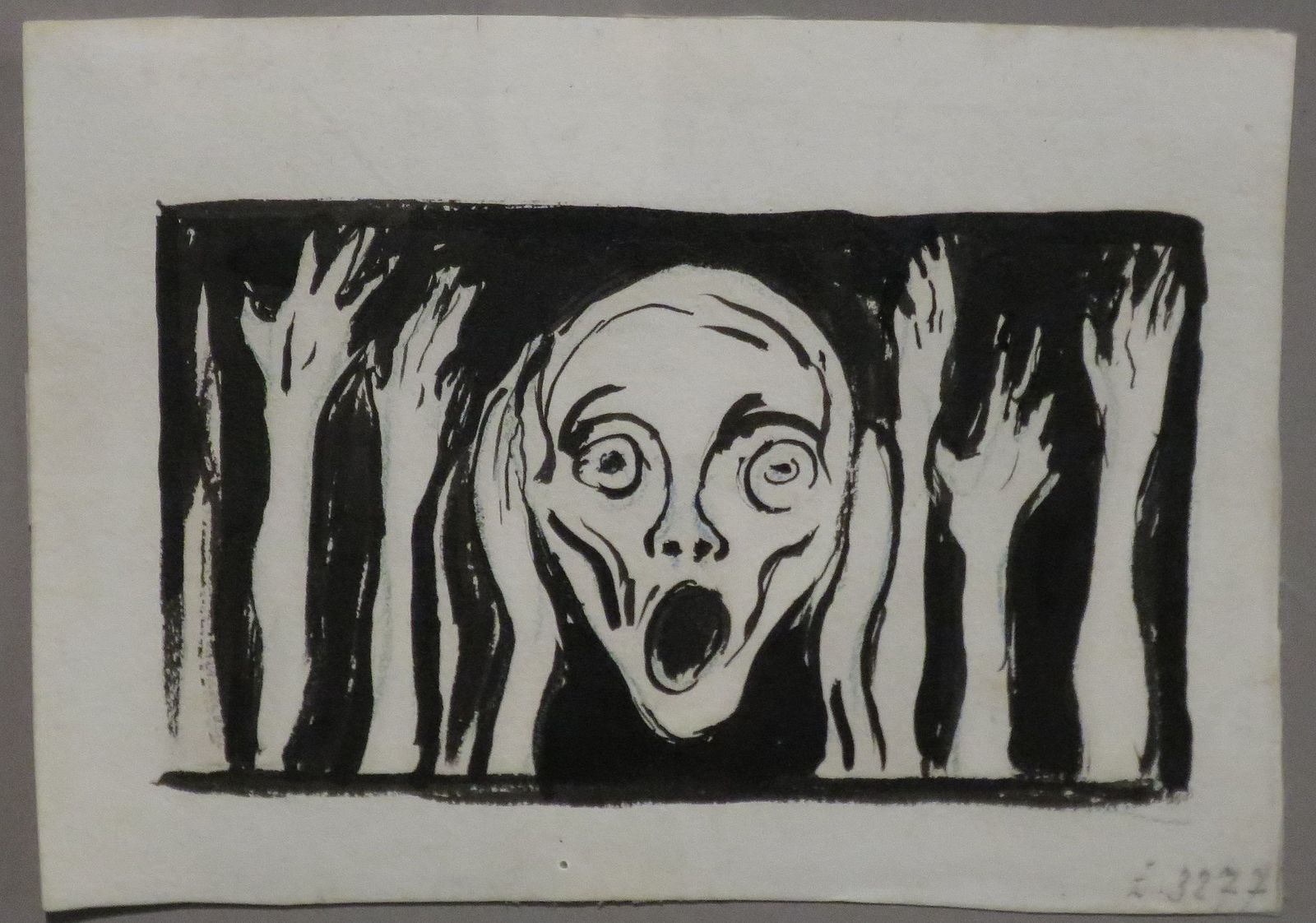 In the other works, nature screamed. In the unnamed drawing, the scream is solely human. Instead of the blazing sky, the artist drew outstretched arms with hands resembling spurts of flame.