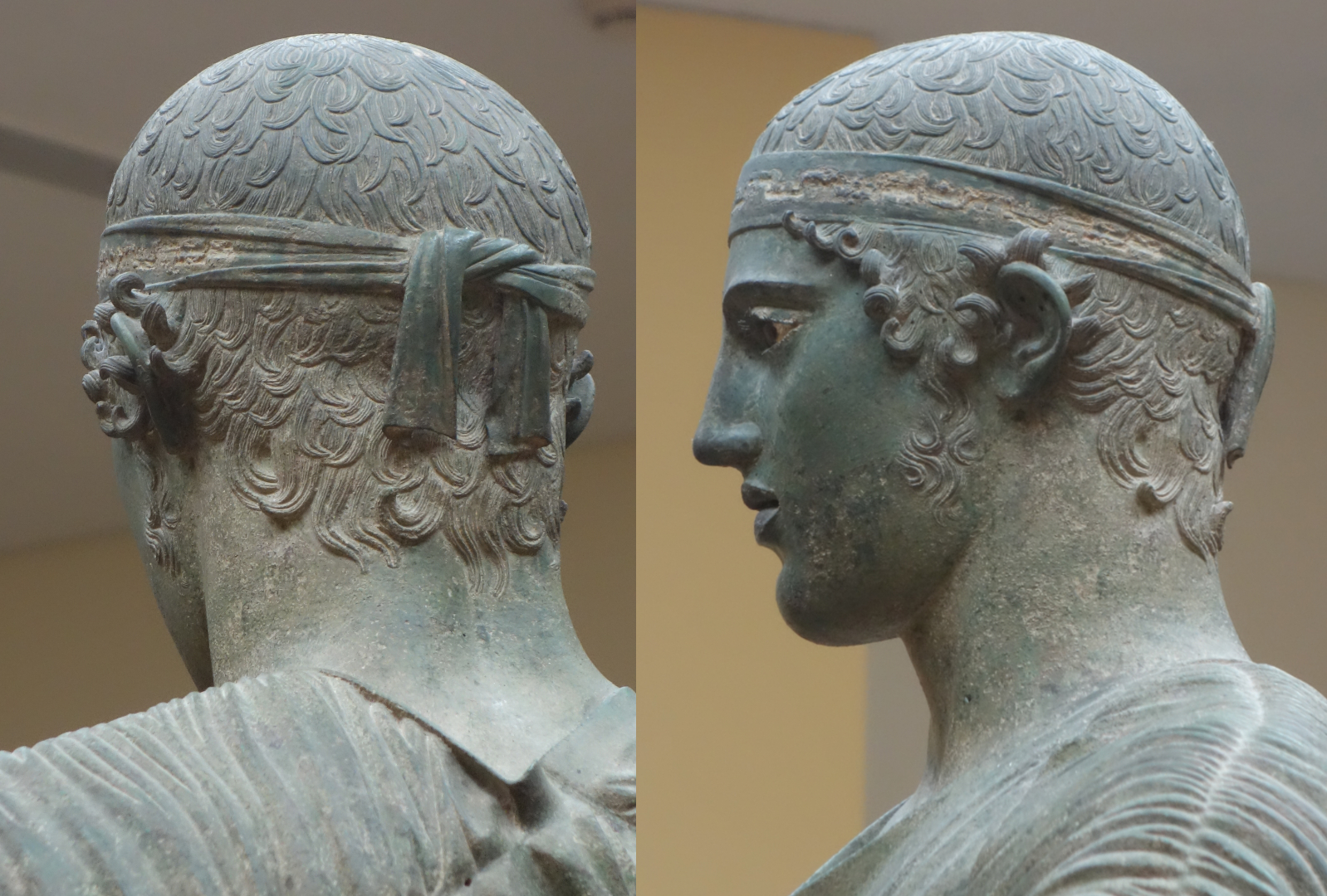 In encyclopedias, the pictures of the Charioteer are usually published together with the photos of two stylistically related figures—the statues recovered from the sea near Italian comune Riace in 1972. The Riace sculptures depict either athletes or warriors. Also made of bronze, they have inlaid eyes, nipples, and lips. The “youngest” warrior has even teeth.